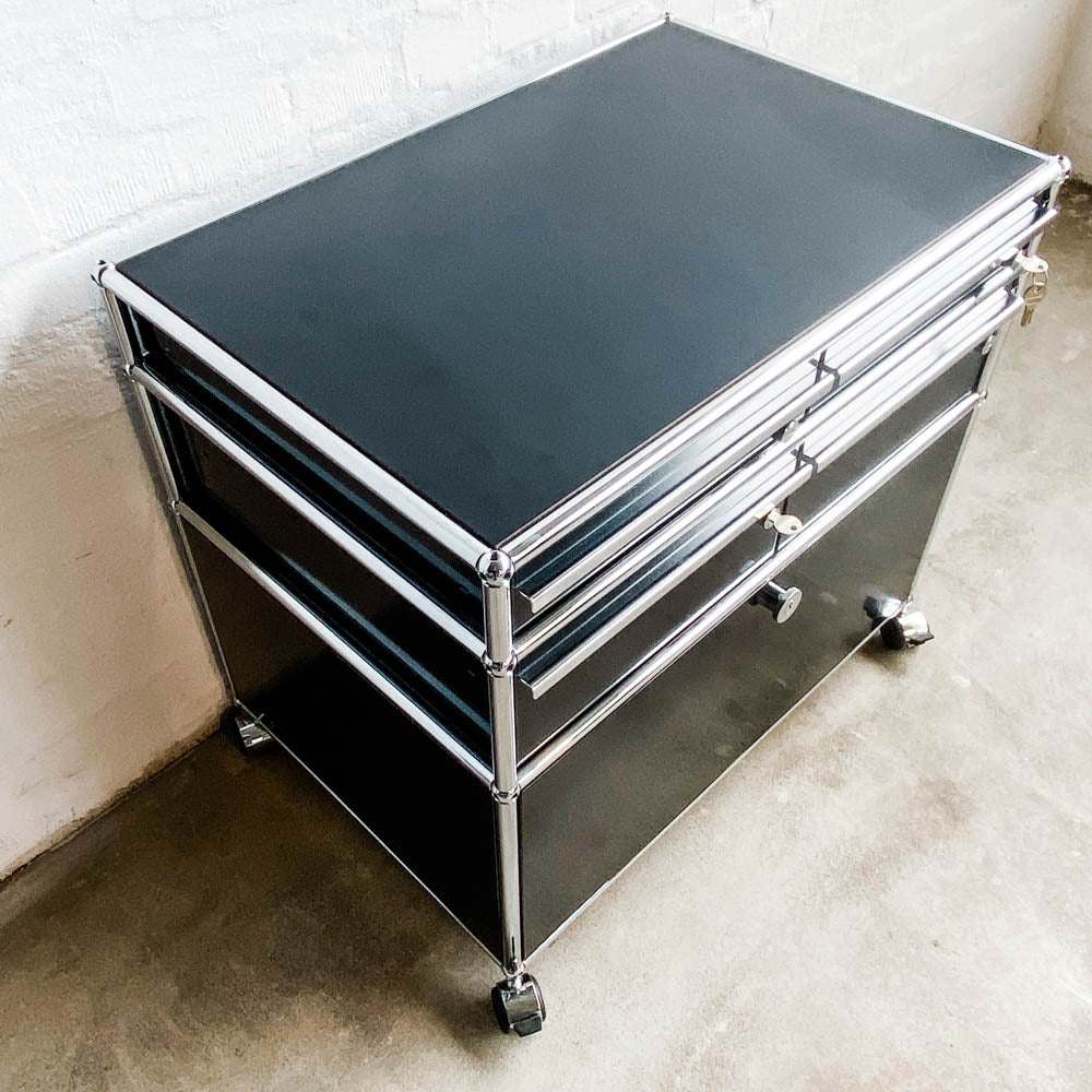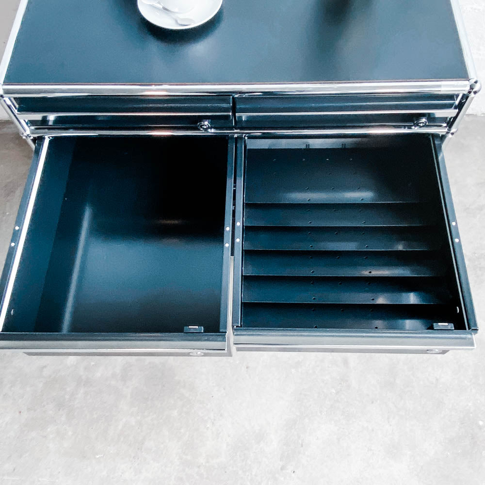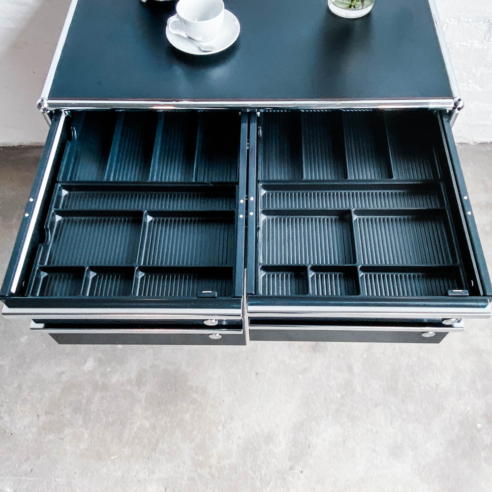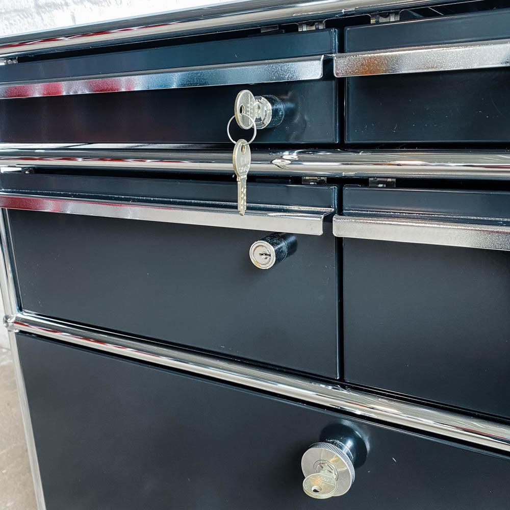 Der original USM Haller Doppelcontainer ist in der obersten Ebene mit zwei A7 Schubladen (ca. 7,5cm Höhe) ausgestattet. Darunter liegend befinden sich zwei A6 Schubladen mit einer Höhe von etwa 15 cm. Im unteren Teil befindet sich ein Vollauszug mit integrierten Hängeregistraturkörben. Der Doppelcontainer ist komplett gleichschließend abschließbar. das obere Tablar ist mit einer Resopalbeschichtung versehen, sodass dieses sehr beständig gegen Kratzer oder ähnliche Beschädigungen ist. Die stimmigen Proportionen und die klassische Kombination aus Chrom und Schwarz machen den Doppelcontainer zu einem super kombinationsfähigen Büromöbel. Der Doppelcontainer ist ein absolutes Allroundtalent und der perfekte Begleiter und Organisator im Büroalltag.