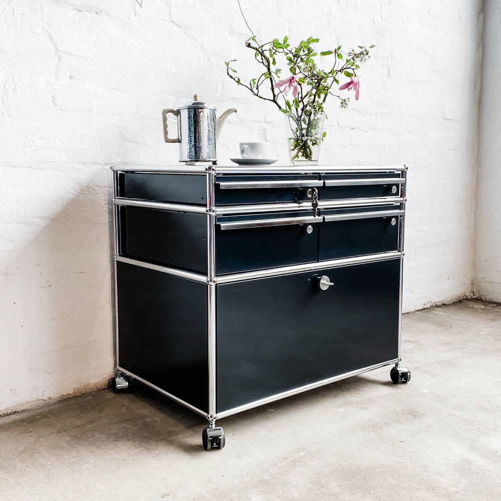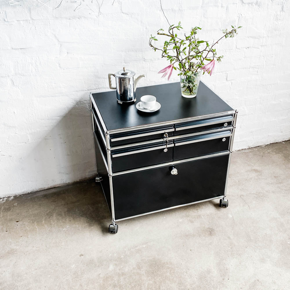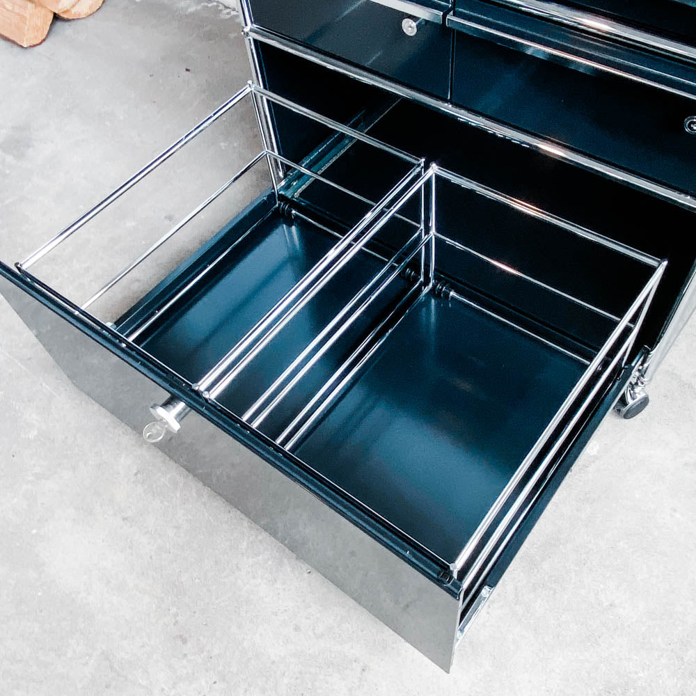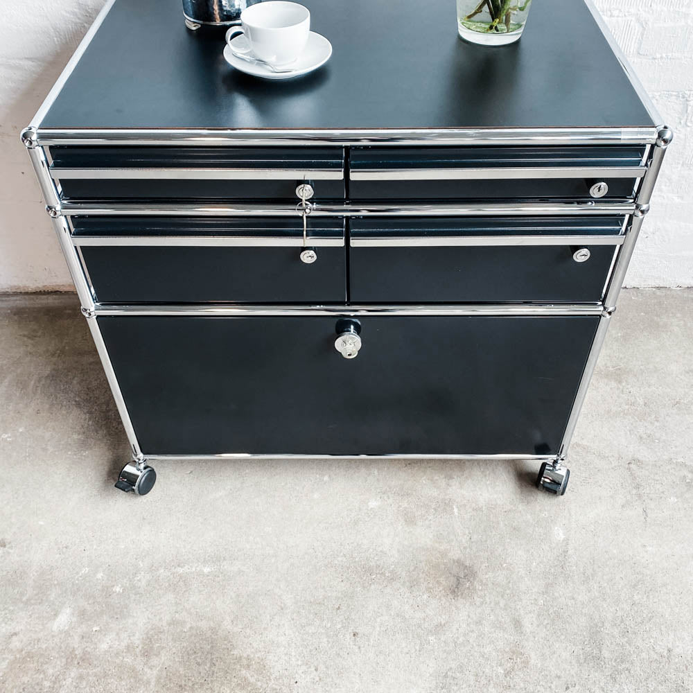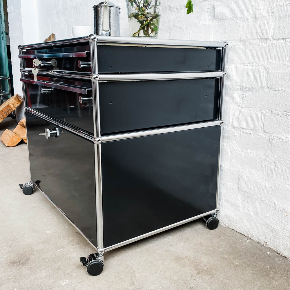 Der original USM Haller Doppelcontainer ist in der obersten Ebene mit zwei A7 Schubladen (ca. 7,5cm Höhe) ausgestattet. Darunter liegend befinden sich zwei A6 Schubladen mit einer Höhe von etwa 15 cm. Im unteren Teil befindet sich ein Vollauszug mit integrierten Hängeregistraturkörben. Der Doppelcontainer ist komplett gleichschließend abschließbar. das obere Tablar ist mit einer Resopalbeschichtung versehen, sodass dieses sehr beständig gegen Kratzer oder ähnliche Beschädigungen ist. Die stimmigen Proportionen und die klassische Kombination aus Chrom und Schwarz machen den Doppelcontainer zu einem super kombinationsfähigen Büromöbel. Der Doppelcontainer ist ein absolutes Allroundtalent und der perfekte Begleiter und Organisator im Büroalltag.