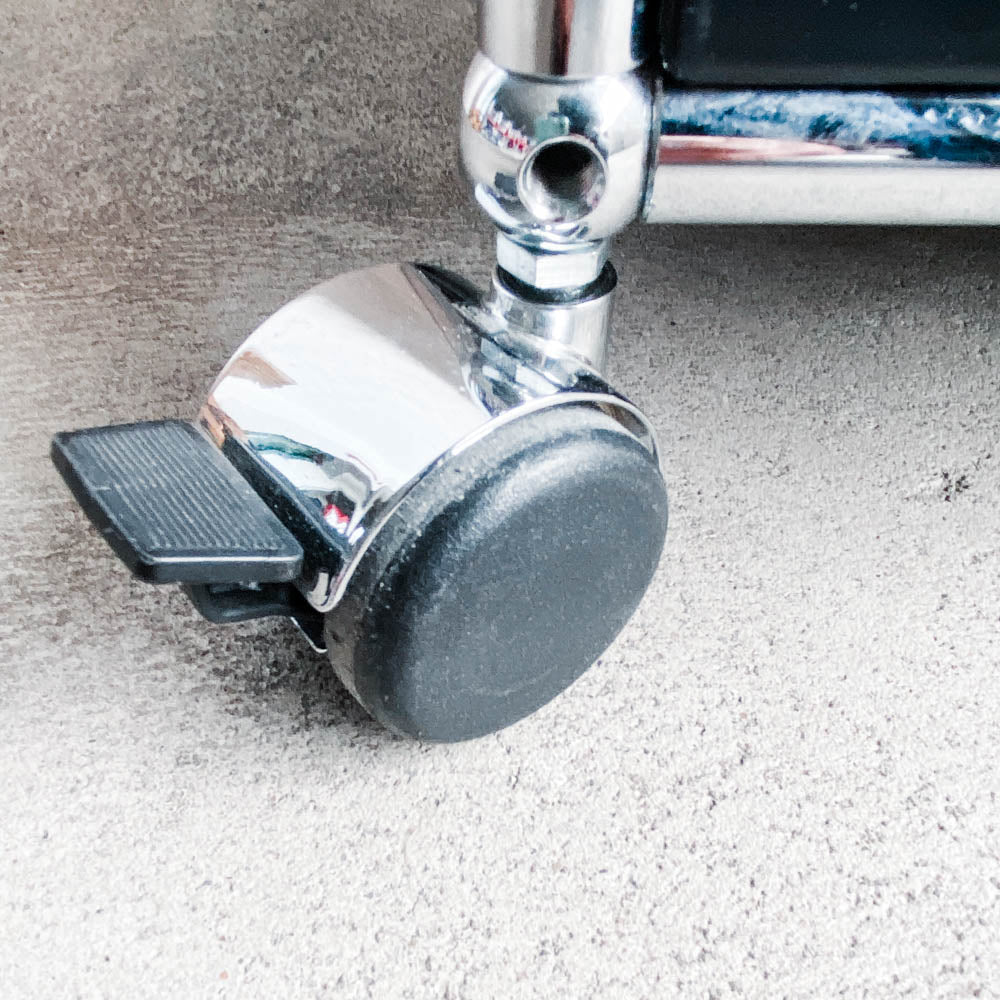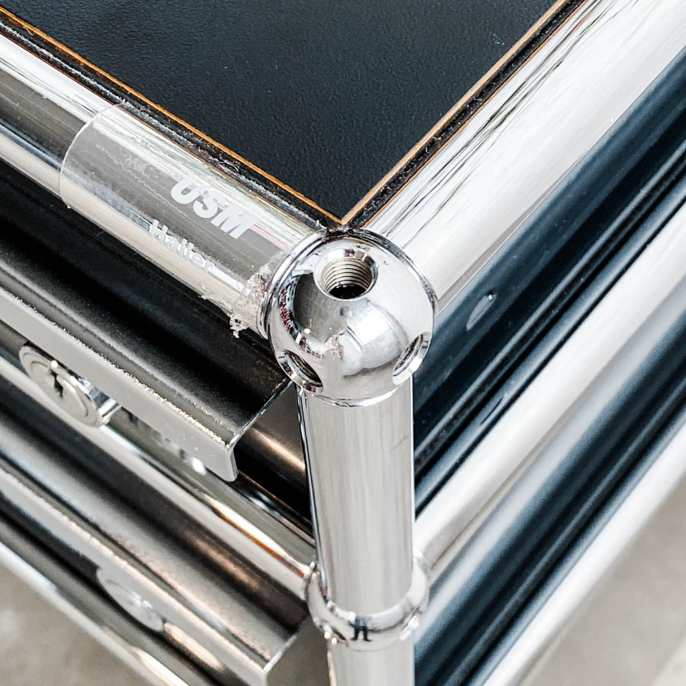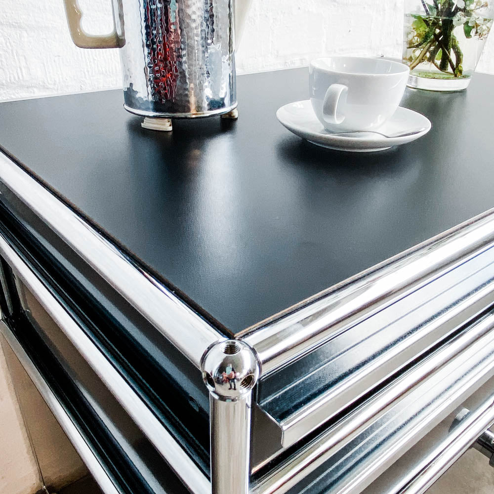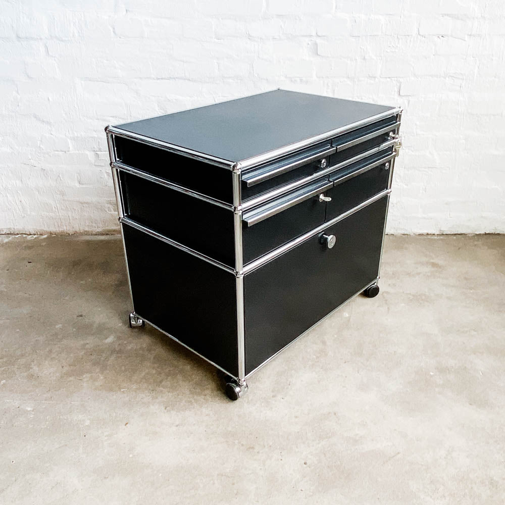 Der original USM Haller Doppelcontainer ist in der obersten Ebene mit zwei A7 Schubladen (ca. 7,5cm Höhe) ausgestattet. Darunter liegend befinden sich zwei A6 Schubladen mit einer Höhe von etwa 15 cm. Im unteren Teil befindet sich ein Vollauszug mit integrierten Hängeregistraturkörben. Der Doppelcontainer ist komplett gleichschließend abschließbar. das obere Tablar ist mit einer Resopalbeschichtung versehen, sodass dieses sehr beständig gegen Kratzer oder ähnliche Beschädigungen ist. Die stimmigen Proportionen und die klassische Kombination aus Chrom und Schwarz machen den Doppelcontainer zu einem super kombinationsfähigen Büromöbel. Der Doppelcontainer ist ein absolutes Allroundtalent und der perfekte Begleiter und Organisator im Büroalltag.