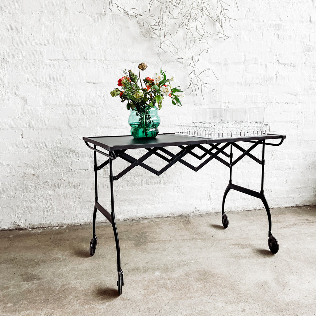 Der schwarze Servierwagen Battista von Kartell ist mehr als nur ein praktischer Rollwagen - Dank der gelungenen Kombination aus Kunststoff und Metall überzeugt er auch als vielseitiger Klapp- und Ausziehwagen . Er eignet sich somit ideal für Buffets, Cocktailpartys oder als kompakter Einzeltisch im Alltag. Er ist perfekt für ein Essen am Sofa.