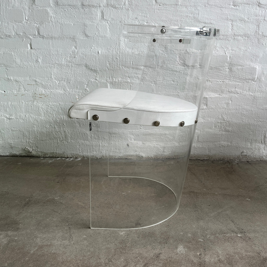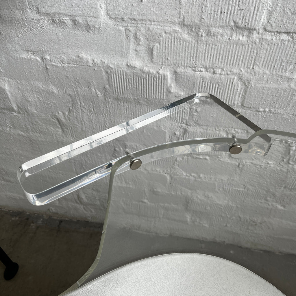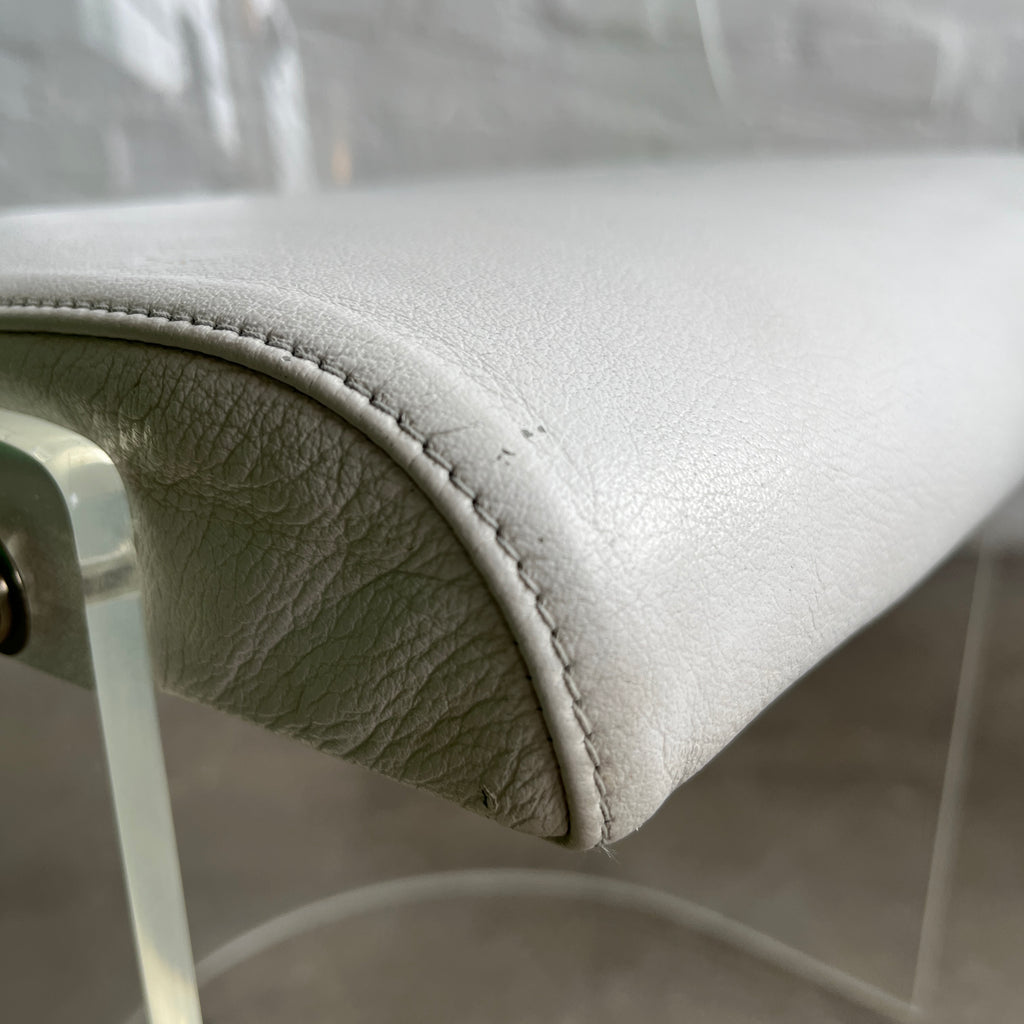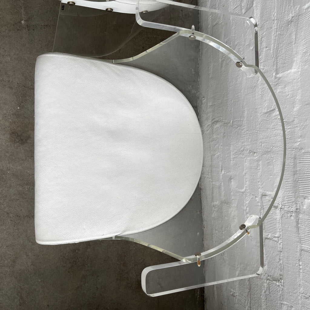 Der Rahmen des Stuhls aus transparentem Plexiglas verleiht ihm eine Leichtigkeit und Klarheit, die mit der minimalistischen Ästhetik der Zeit korrespondiert. Die Sitzfläche, aus hochwertigem weißem Leder, sorgt nicht nur für Komfort, sondern verstärkt auch die edle, zeitlose Ausstrahlung des Stücks.