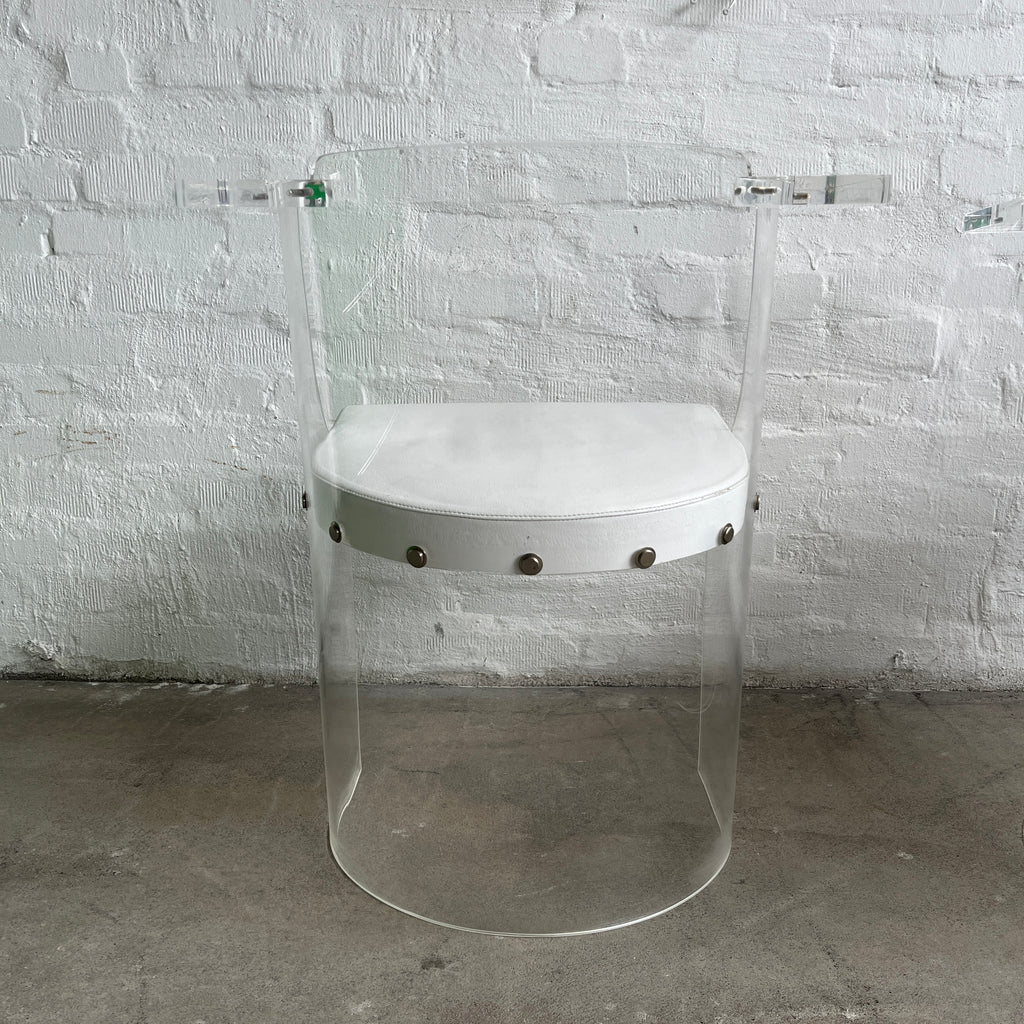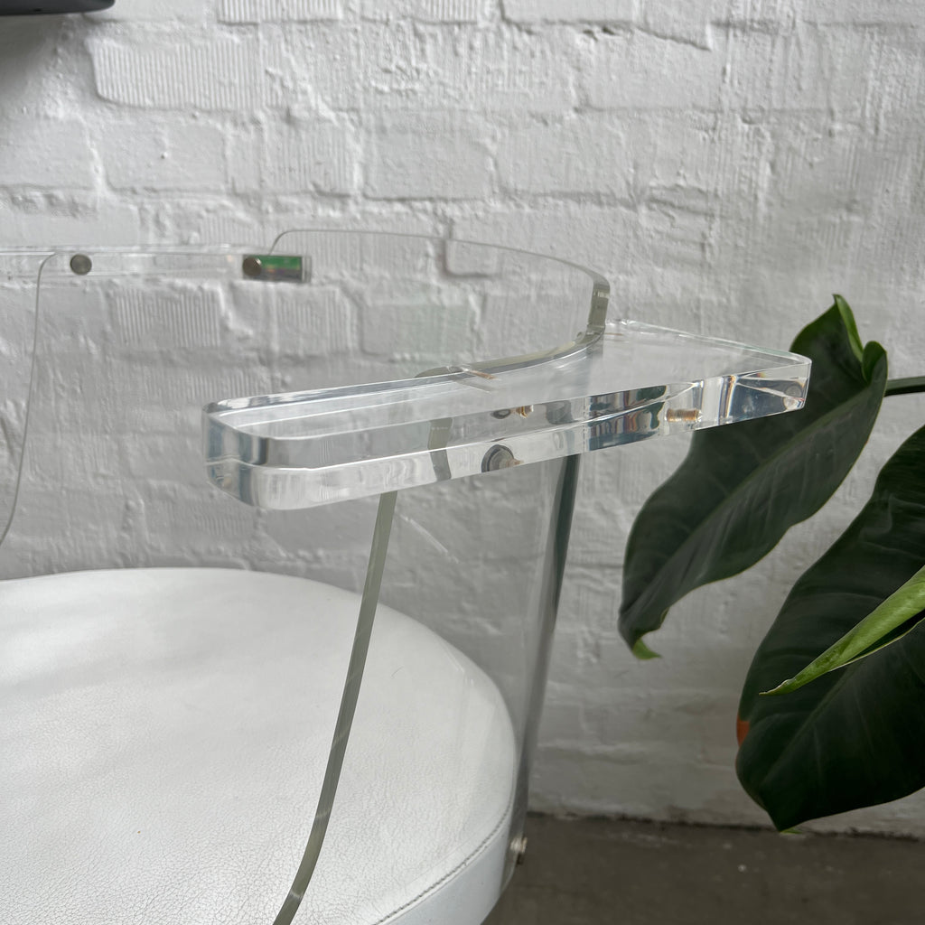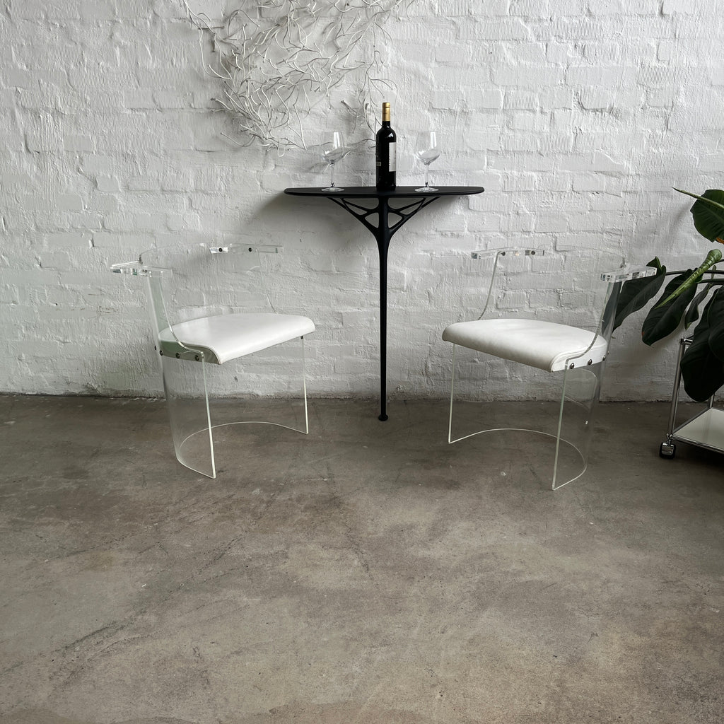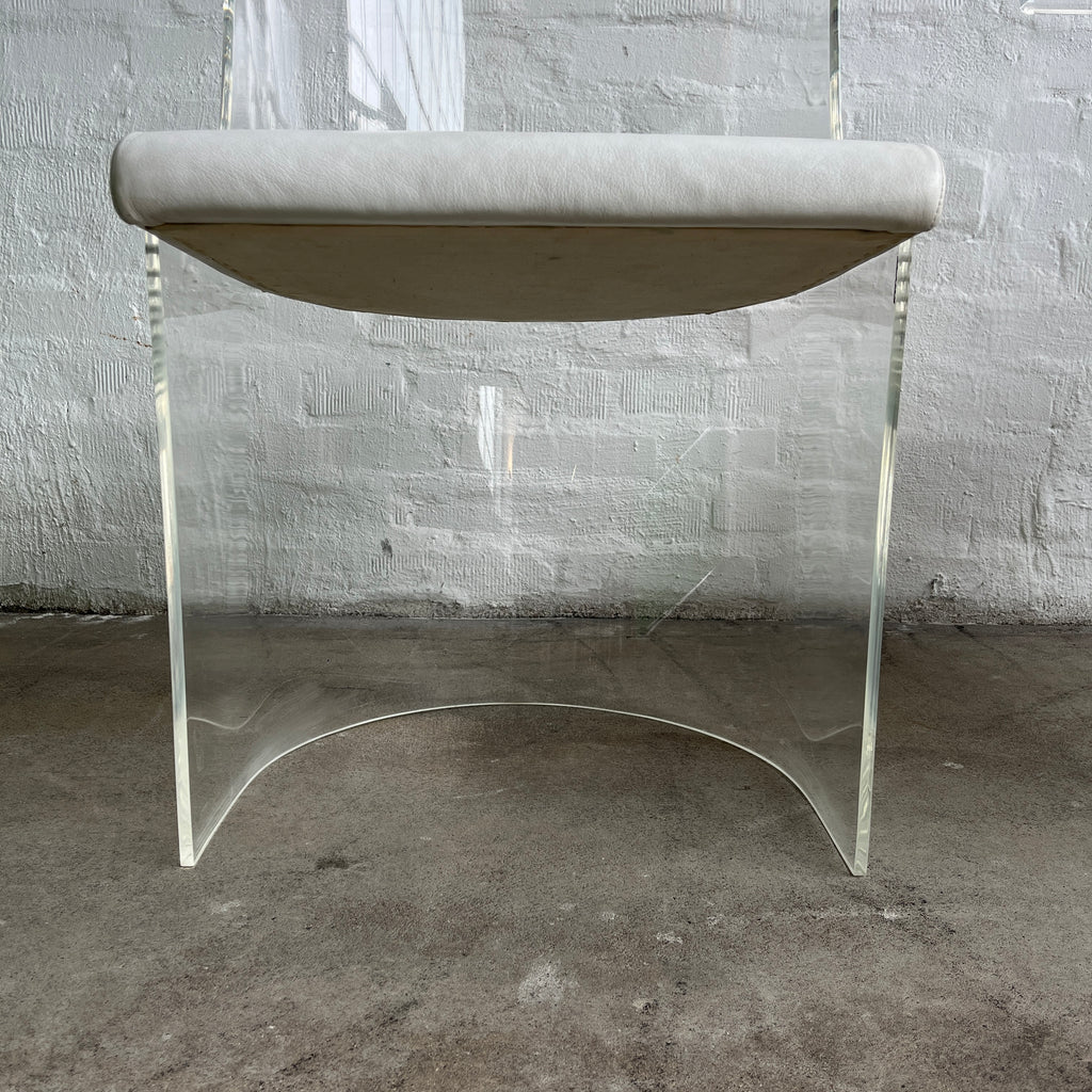 Der Rahmen des Stuhls aus transparentem Plexiglas verleiht ihm eine Leichtigkeit und Klarheit, die mit der minimalistischen Ästhetik der Zeit korrespondiert. Die Sitzfläche, aus hochwertigem weißem Leder, sorgt nicht nur für Komfort, sondern verstärkt auch die edle, zeitlose Ausstrahlung des Stücks.