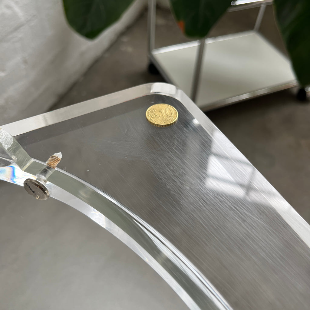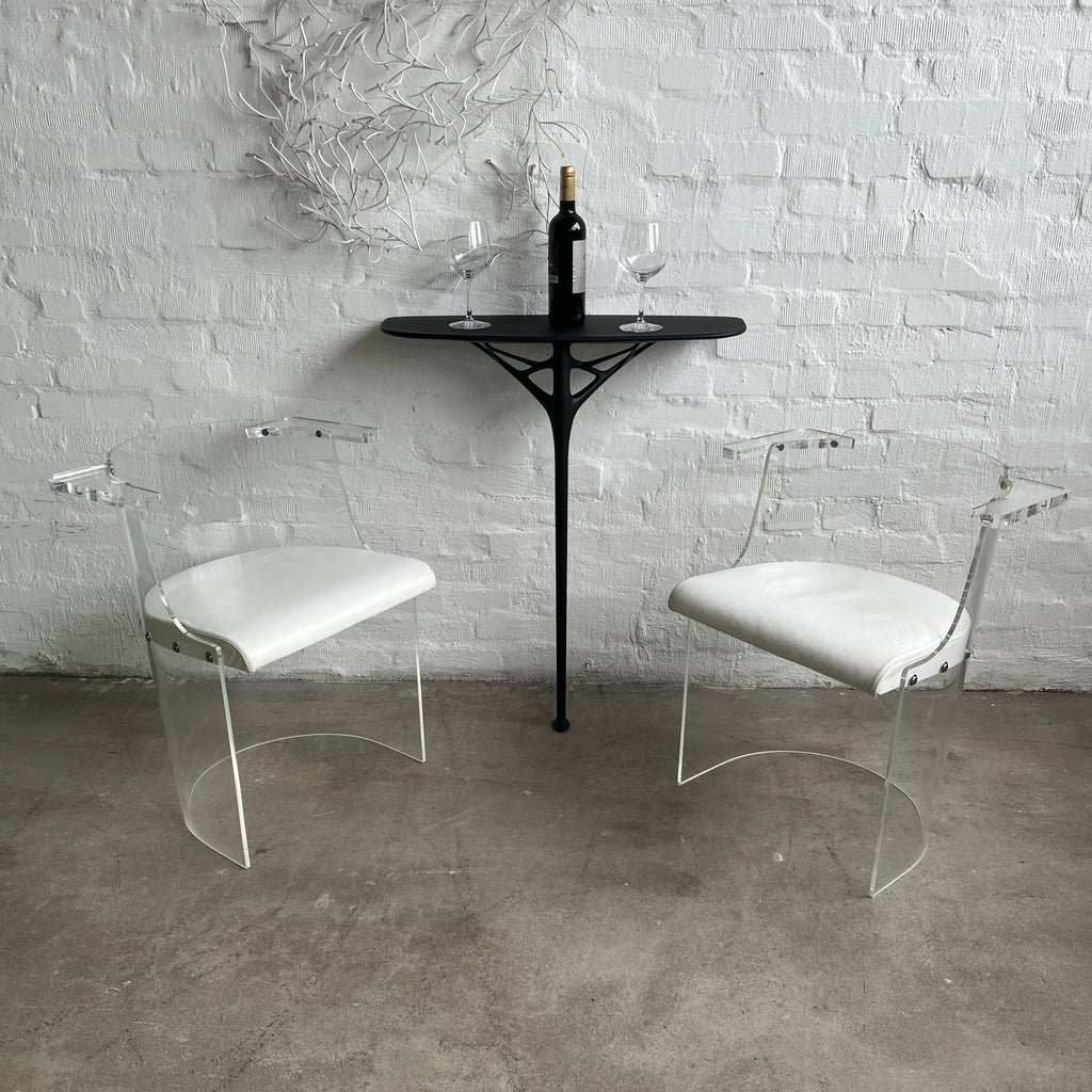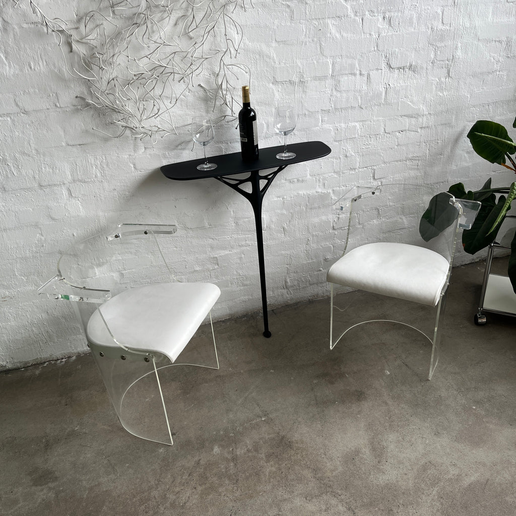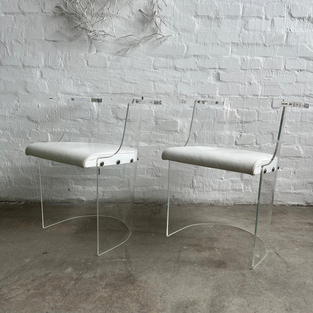 Der Rahmen des Stuhls aus transparentem Plexiglas verleiht ihm eine Leichtigkeit und Klarheit, die mit der minimalistischen Ästhetik der Zeit korrespondiert. Die Sitzfläche, aus hochwertigem weißem Leder, sorgt nicht nur für Komfort, sondern verstärkt auch die edle, zeitlose Ausstrahlung des Stücks.