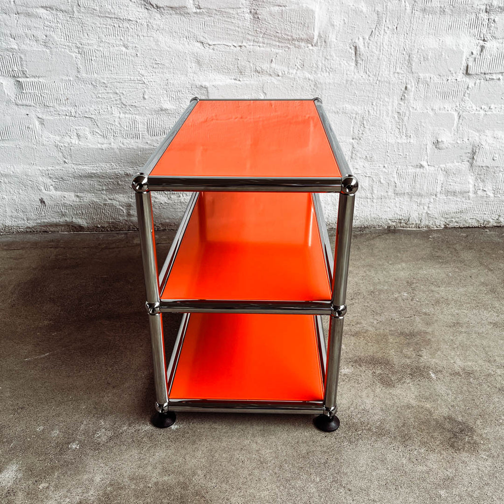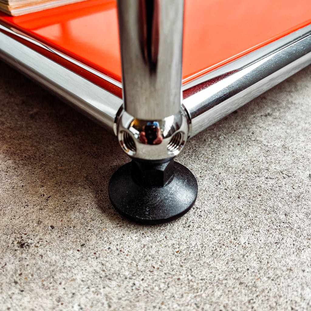 Kompakt, auffällig, funktional – dieser Beistelltisch von USM Haller in kräftigem Orange ist ein echtes Design-Statement. Ideal als Ablage im Wohnbereich, Nachttisch oder kleines Regal. Der kleine Tisch weist drei Ebenen mit einer Fachhöhe von jeweils 17,5 cm auf und ist somit perfekt für Bücher, Accessoires & Co geeignet.