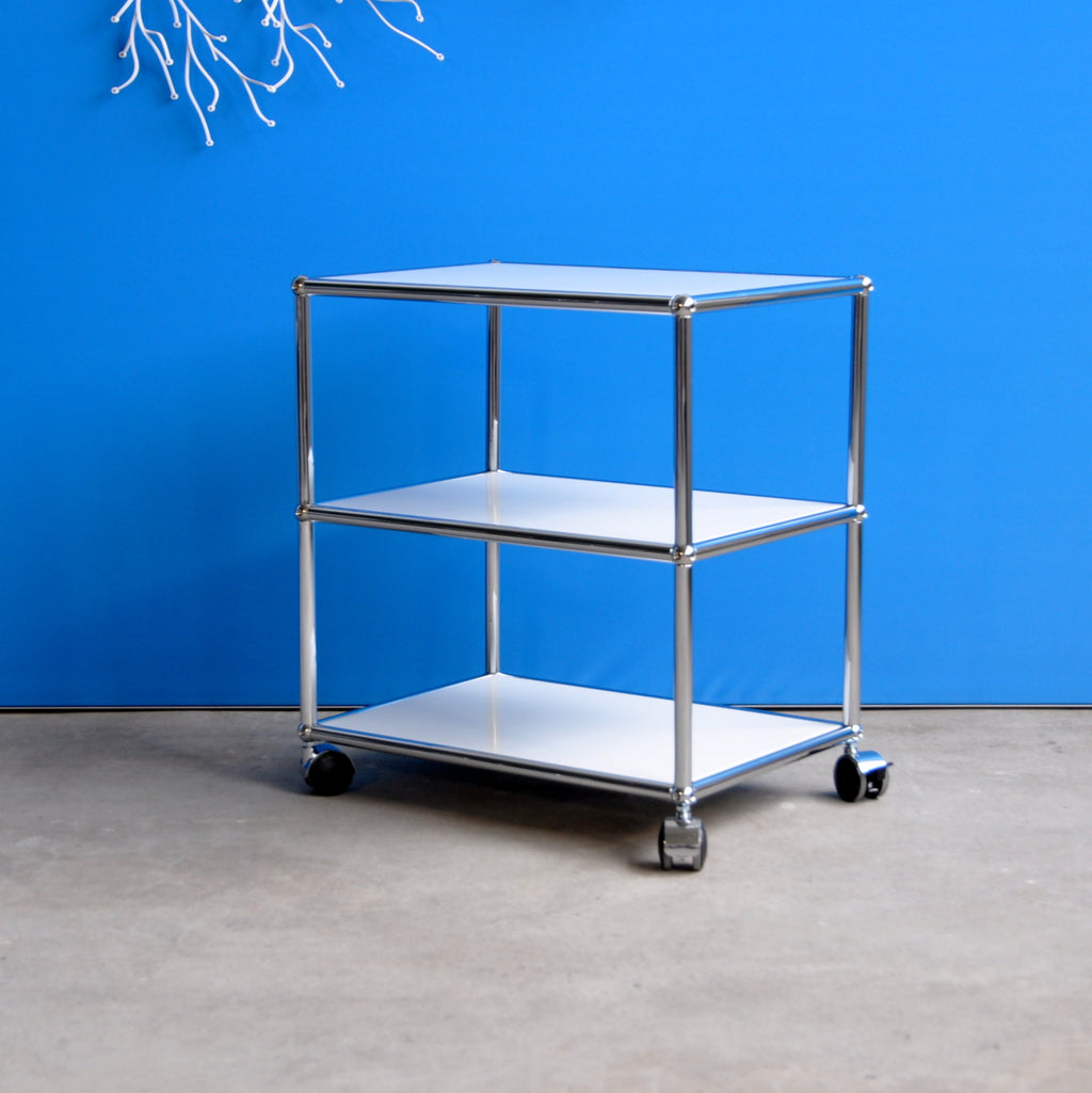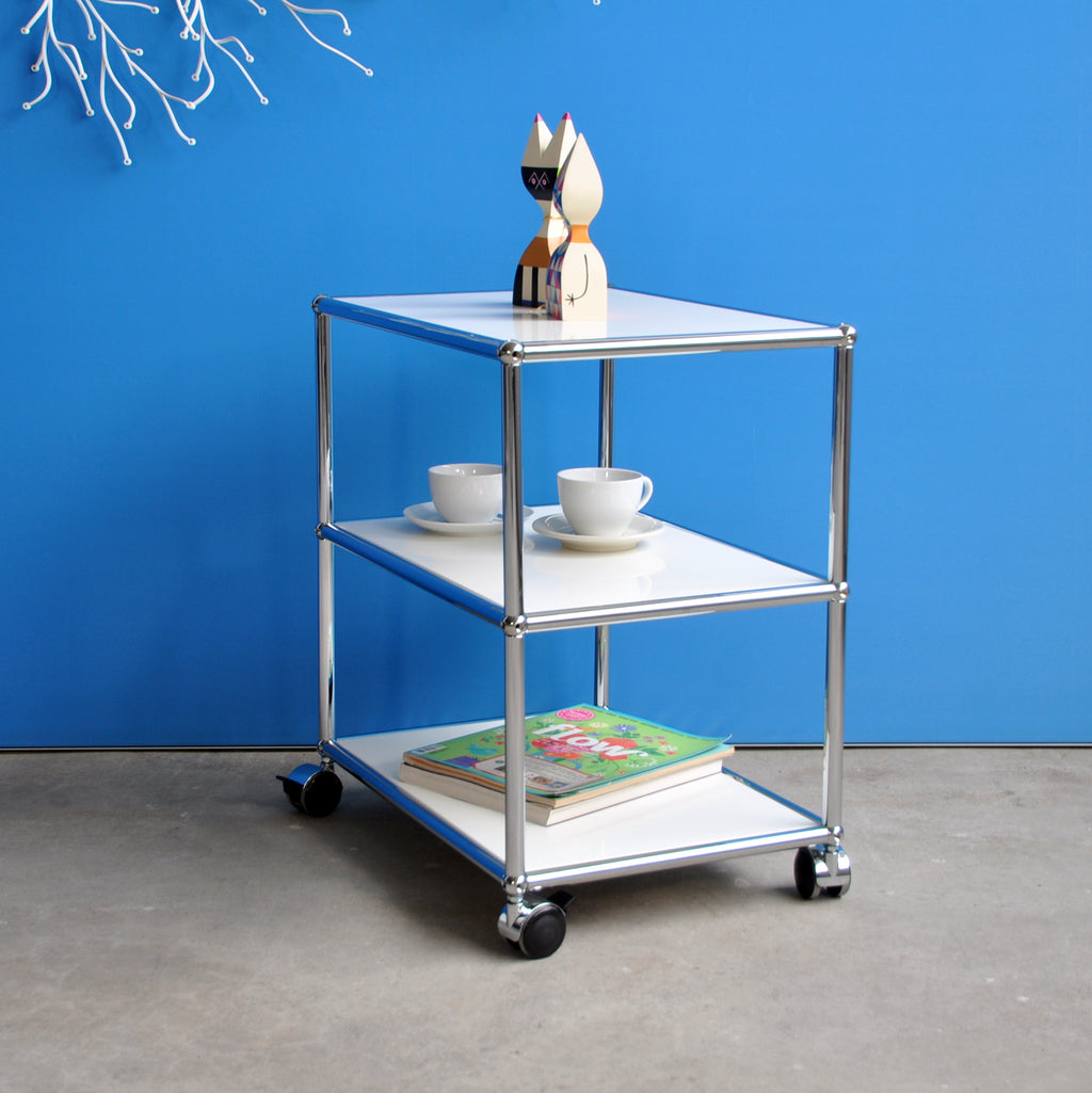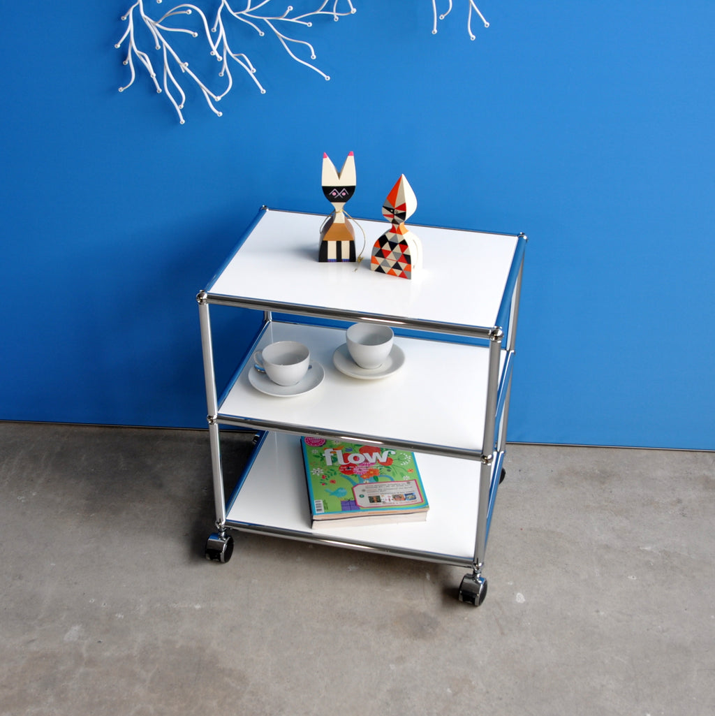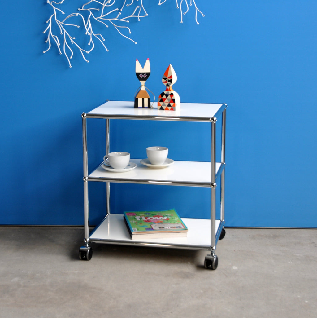 Der praktische USM Haller Beistelltisch ist überall einsatzbereit. Er seht auf vier Rollen von denen zwei bremsbar sind. Der kleine Tisch hat drei Ebenen mit einer Fachhöhe von jeweils 25 cm. Deshalb bietet er viel Ablageplatz und ist zudem mobil. Sowohl neben der Couch, als auch beim Servieren macht der vielseitige Beistelltisch eine gute Figur.