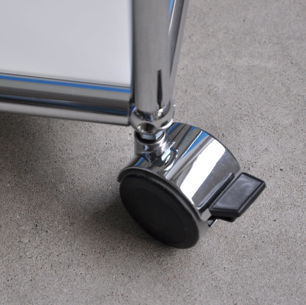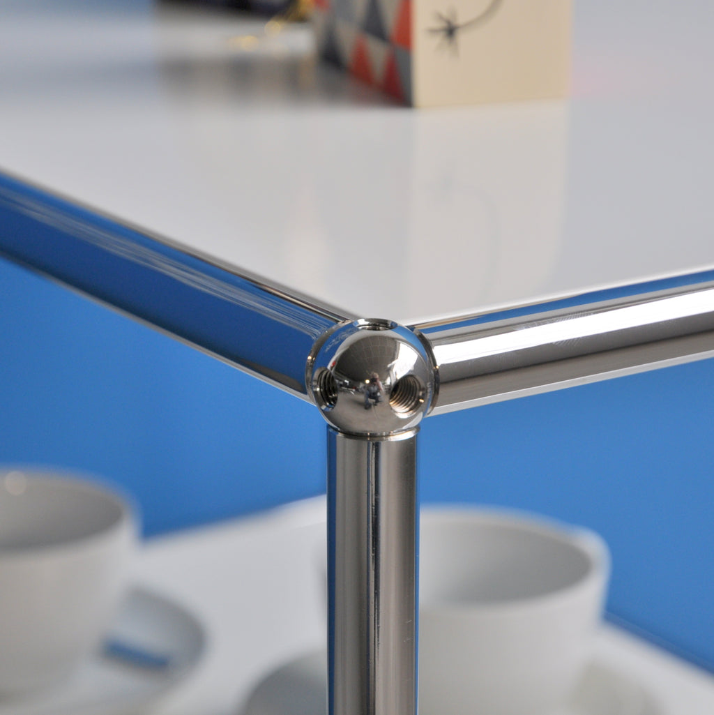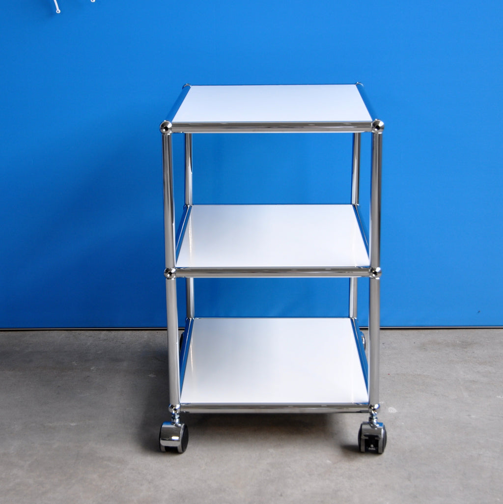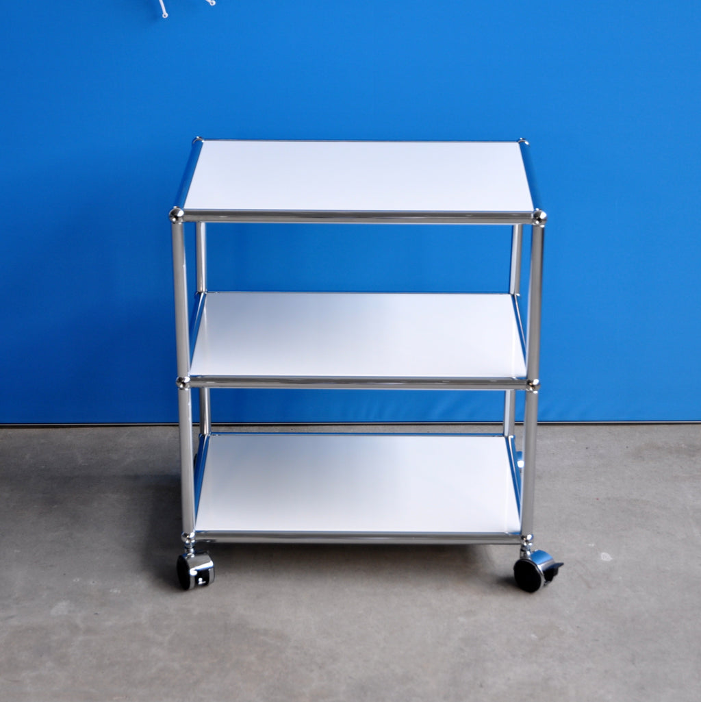 Der praktische USM Haller Beistelltisch ist überall einsatzbereit. Er seht auf vier Rollen von denen zwei bremsbar sind. Der kleine Tisch hat drei Ebenen mit einer Fachhöhe von jeweils 25 cm. Deshalb bietet er viel Ablageplatz und ist zudem mobil. Sowohl neben der Couch, als auch beim Servieren macht der vielseitige Beistelltisch eine gute Figur.