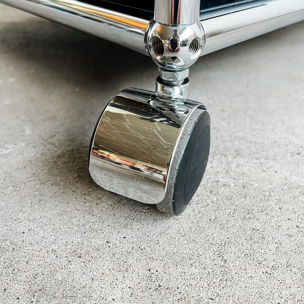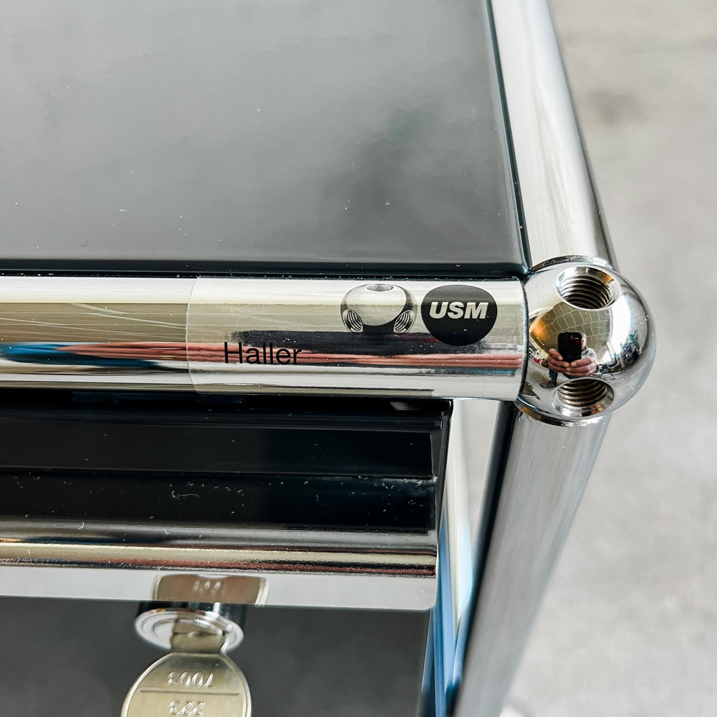 Der elegante schwarze USM Haller Druckerwagen bietet nicht nur funktionale, sondern auch stilvolle Lösungen für Ihr Büro oder Zuhause. Ausgestattet mit einer praktischen A5 Schublade (25 cm hoch), die sich abschließen lässt, sorgt dieser Wagen für eine geordnete und sichere Aufbewahrung Ihrer wichtigen Unterlagen oder Zubehörteile. Die Schublade ist mit einer Materialeinsatzschale ausgestattet (siehe Fotos). Dank der Rollenkonstruktion lässt sich der Wagen mühelos verschieben, sodass Sie flexibel und mobil bleiben, ohne auf Stabilität und Qualität zu verzichten. Der Druckerwagen passt perfekt zu Ihrem Arbeitsbereich und ergänzt Ihre Einrichtung auf minimalistischen Design, das USM Haller berühmt gemacht hat.