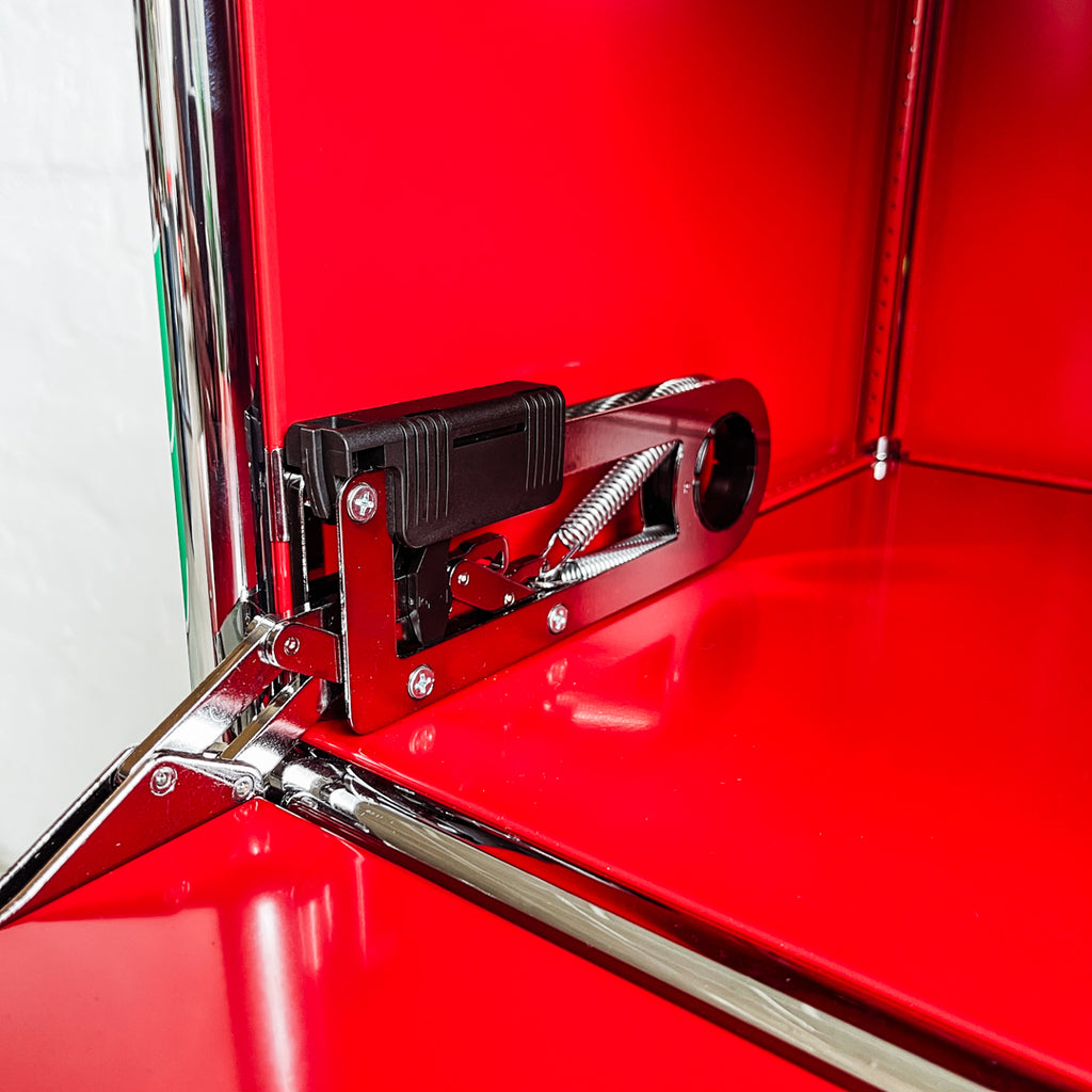 Ein zeitloser Designklassiker in kräftigem Rubinrot – dieses elegante USM Haller Highboard überzeugt durch klare Linien, hochwertige Verarbeitung und vielseitige Einsatzmöglichkeiten. Ideal einsetzbar im Wohn-, Arbeitsraum oder Büro. Das Highboard hat drei übereinander angeordnete Fächer mit einer jeweiligen Höhe von 35 cm. Das obere und das untere Fach ist jeweils mit einer Klapptür ausgestattet. Diese sind somit ideal zur Aufbewahrung geeignet. Das offene mittlere Fach verfügt über seitliche Tablare und ist somit perfekt für Bücher, Dekoration oder häuftig genutzte Gegenstände.