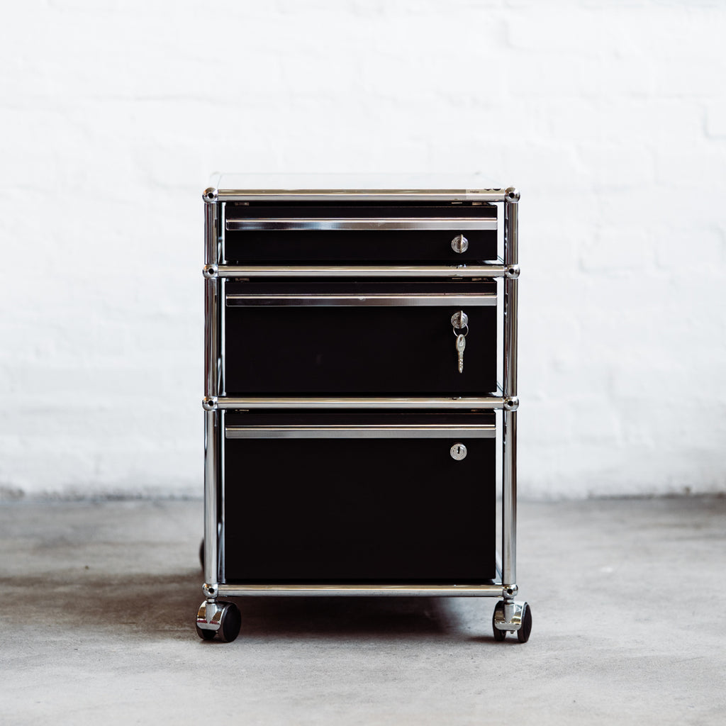 Der schwarze USM Haller Rollcontainer bietet mit seinen drei unterschiedlich hohen Schubladen eine optimale Aufbewahrungslösung für Ihr Büro. Die obere A7-Schublade (ca. 8 cm hoch) eignet sich perfekt für kleinere Büroartikel, während die mittlere A6-Schublade (ca. 15 cm hoch) mehr Platz für Schreibutensilien oder Dokumente bietet. Die untere A5-Schublade (ca. 23 cm hoch) ermöglicht die Aufbewahrung von größeren Akten oder Ordnern. Die Schubladen sind sogar abschließbar und gewähren daher sicheren Zugriff auf Ihre Unterlagen.