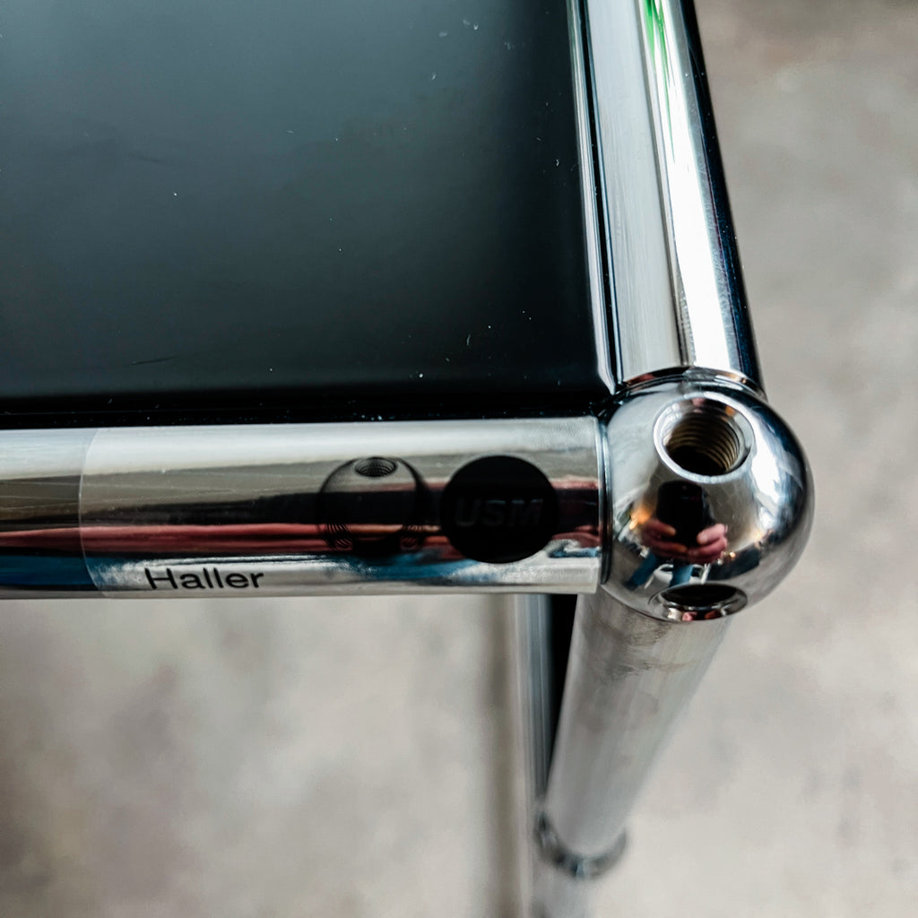 Achte auf das originale USM-Logo an den Röhrenverbindern und die typischen Metallkugeln an den Verbindungspunkten. Nachbauten oder Kopien sind oft an leicht abweichenden Maßen oder Verbindungen zu erkennen. - Zustand bewerten